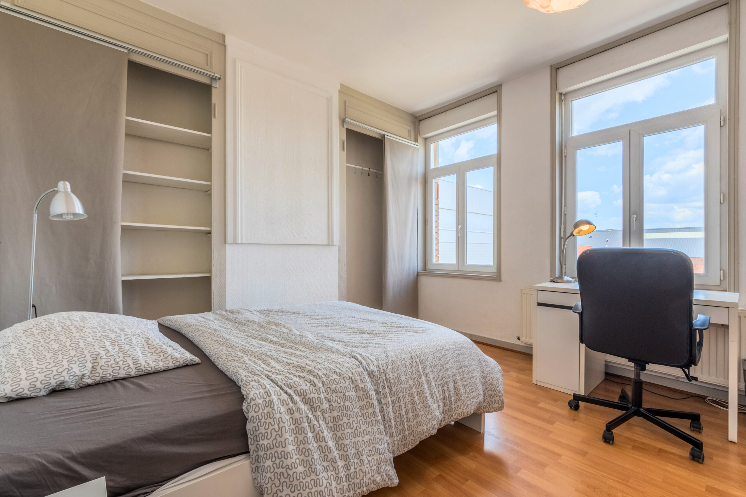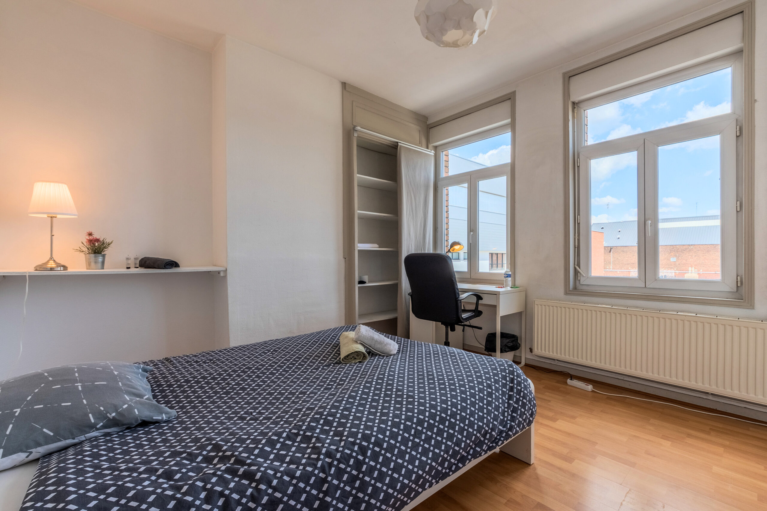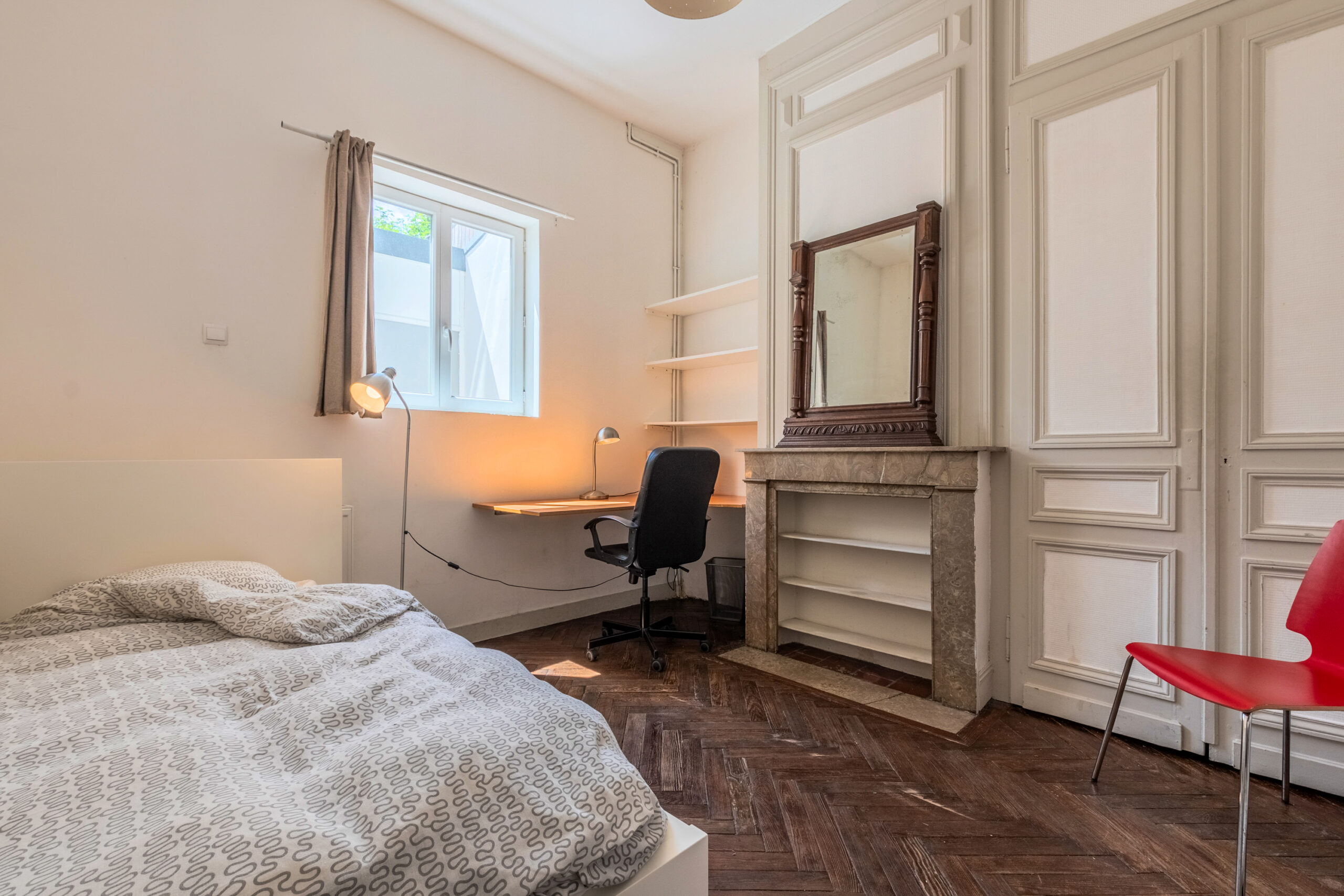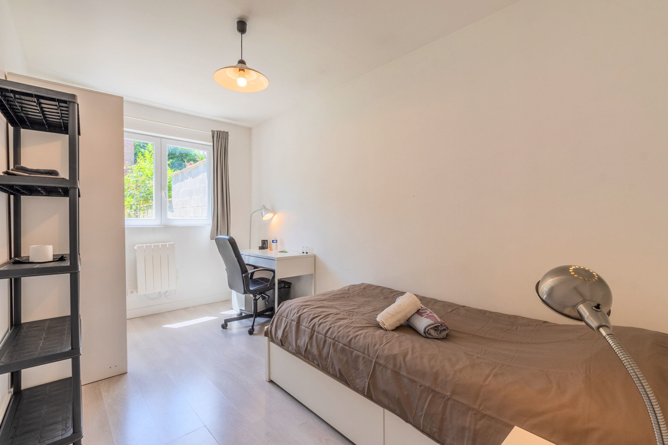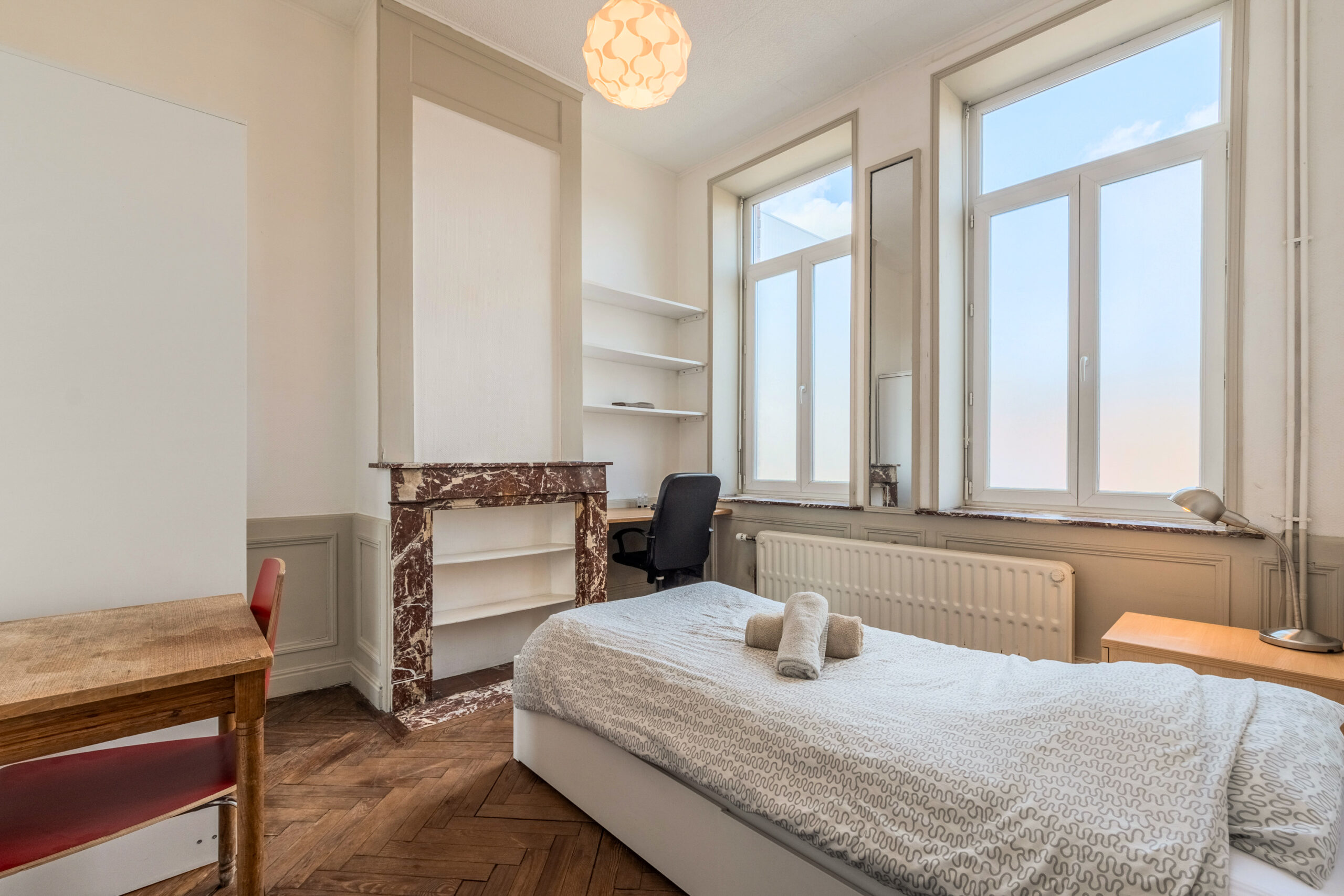 Cette maison entièrement rénovée de 160 m², située en plein cœur de Lille, propose 9 chambres privatives, chacune équipée d’un lit avec rangements, d’une couette, d’un oreiller, d’un bureau, d’une chaise, d’une penderie, d’un miroir, d’un panier et d’étagères.