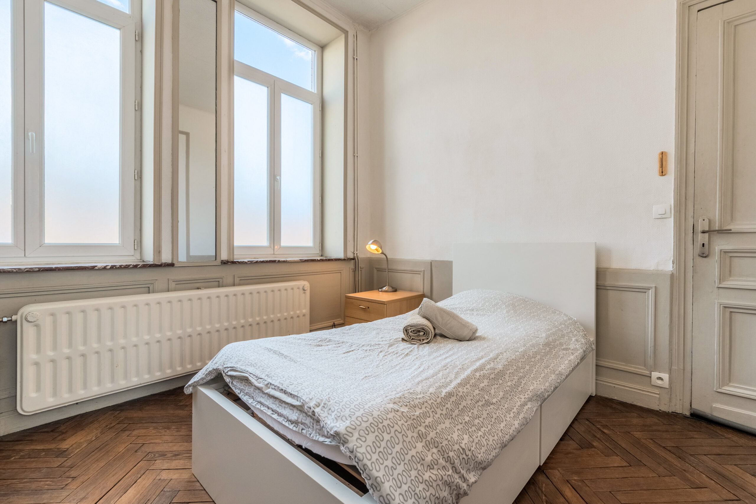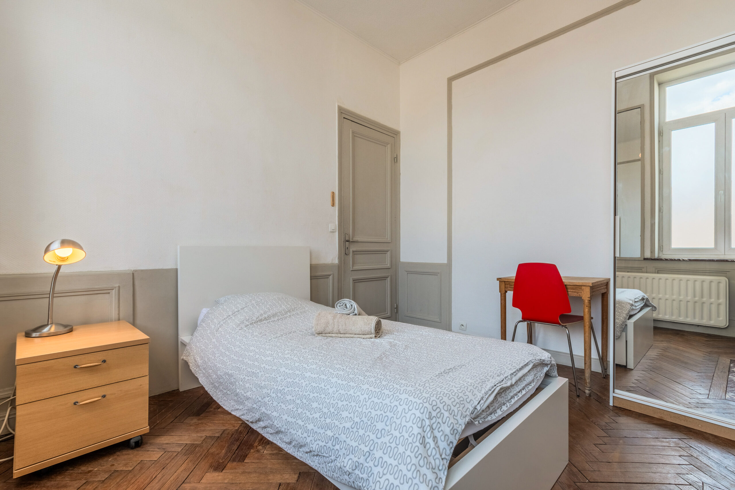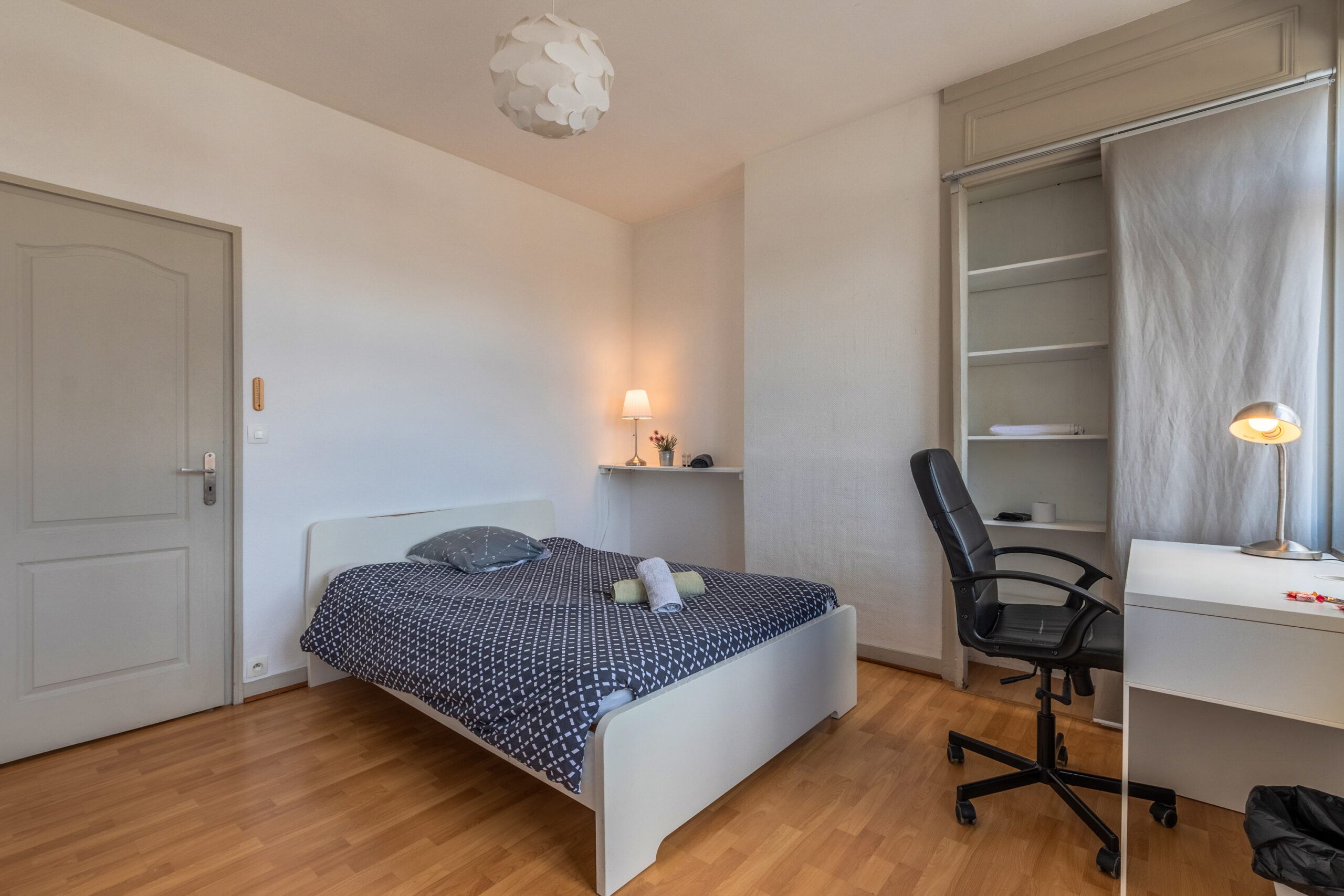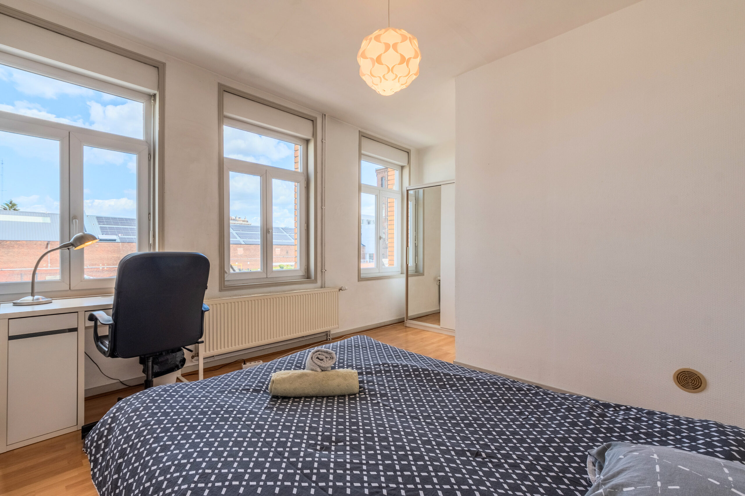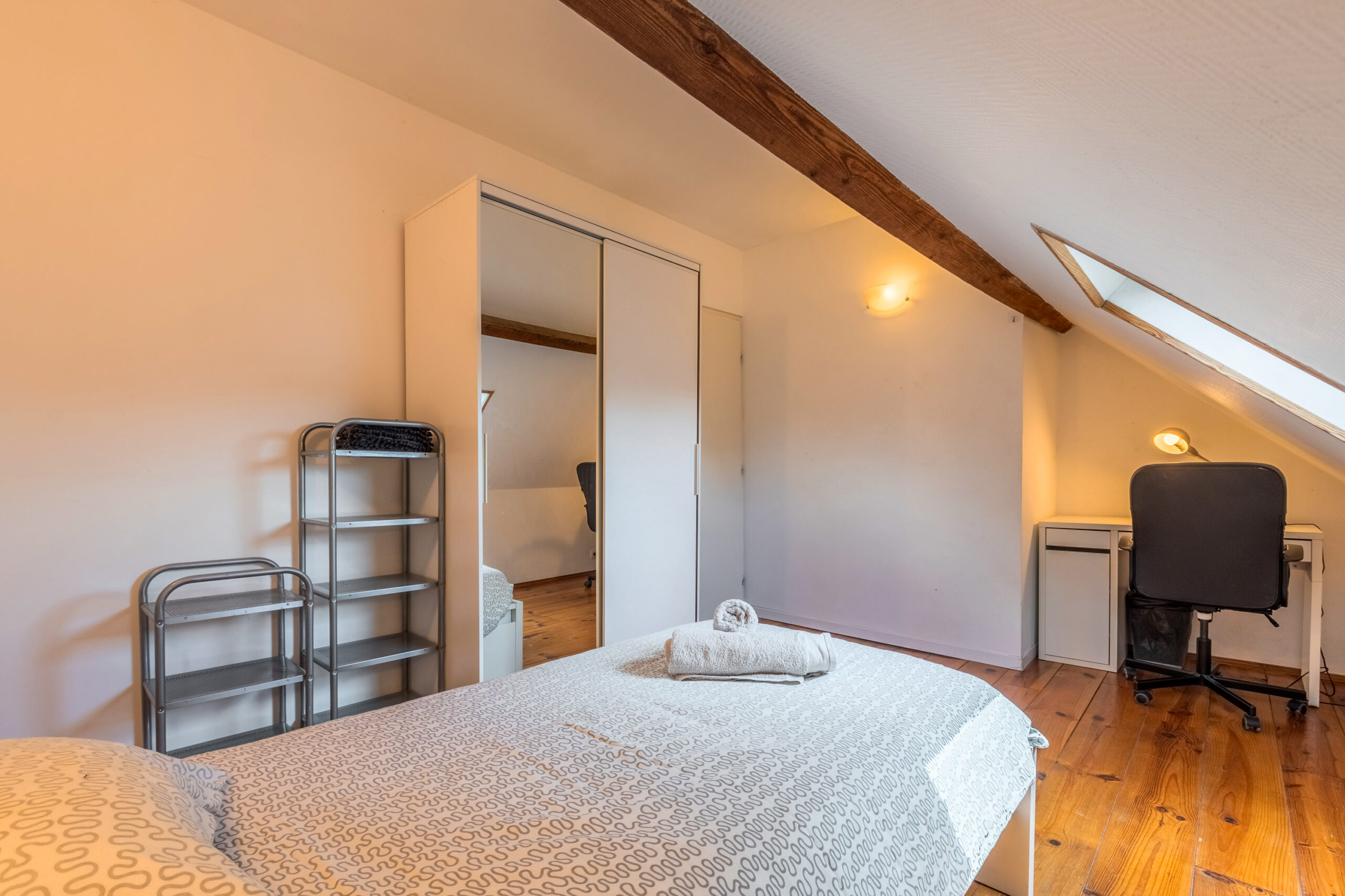 Cette maison entièrement rénovée de 160 m², située en plein cœur de Lille, propose 9 chambres privatives, chacune équipée d’un lit avec rangements, d’une couette, d’un oreiller, d’un bureau, d’une chaise, d’une penderie, d’un miroir, d’un panier et d’étagères.